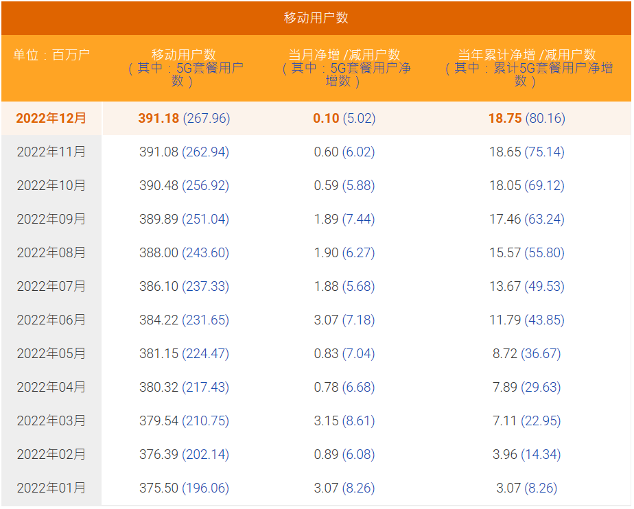 2022年12月,中國電信移動(dòng)用戶數(shù)凈增10萬戶,移動(dòng)用戶數(shù)累計(jì)3.9118億戶。其中,5G套餐用戶凈增502萬戶,5G套餐用戶數(shù)累計(jì)2.6796億戶。