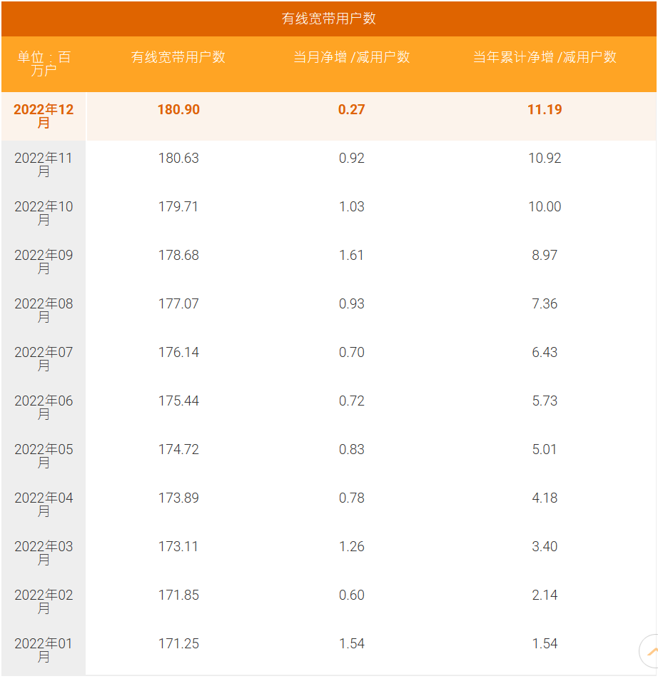 有線寬帶業(yè)務(wù)方面,2022年12月中國電信有線寬帶用戶數(shù)凈增27萬戶,有線寬帶累計(jì)用戶數(shù)1.809億戶。固定電話業(yè)務(wù)方面,2022年12月中國電信固定電話用戶數(shù)凈減41萬戶,固定電話累計(jì)用戶數(shù)1.0495億戶。