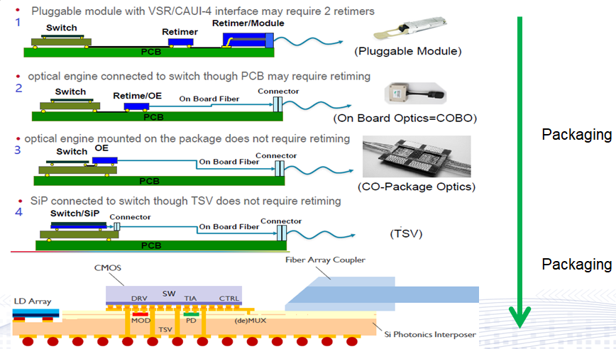 在傳統(tǒng)電信市場,光芯片先要封裝進(jìn)氣密性的TO/OSA/BOX器件,光器件再焊接到SMT了電芯片的PCBA,組裝測試出成品光模塊。前幾年開始大規(guī)模鋪設(shè)GPON的時候,為了降低成本,業(yè)界最終都采用了BOB(BOSA on Board)方案,將BOSA直接放在光貓的主板上面,整個簡化掉了GPON光模塊的封裝。發(fā)端于數(shù)據(jù)中心應(yīng)用的COB(Chip on Board)直接將裸的光芯片(LD/PD)和裸的電芯片(Driver/TIA/LA)直接貼到光模塊PCB板上,通過減少器件封裝層級和減少電芯片的封裝成本達(dá)到降低成本的效果,也因?yàn)楣?jié)約了封裝尺寸,更容易做到高密度。當(dāng)然,這個過程中也折中和平衡掉了氣密性等原來的部分優(yōu)點(diǎn),在有些應(yīng)用場景還不能完全被接受。硅光芯片從半導(dǎo)體工藝的角度進(jìn)一步提高了光電芯片的集成度,但是其后端模塊封裝工藝,還是和COB/COC模式類似的。COBO和Co-packaging的思路是進(jìn)一步縮短光電模組和ASIC芯片的距離,到TSV interposer這里幾乎達(dá)到了最短距離。