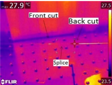 下圖為光纖熔接點(diǎn)在紅外熱相儀測試下光纖熔點(diǎn)的溫度分布情況。對(duì)于光纖切口漏光主要有很多原因,可能是涂覆層傳導(dǎo)的光切口處散射出去;也可能是包層模場能量在邊界條件變化時(shí)(由涂覆層變?yōu)榭諝猓┮徊糠止庑孤冻鰜怼?