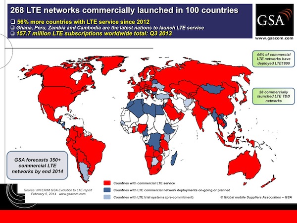 ICCSZ訊 近日,GSA(全球移動設(shè)備供應(yīng)商協(xié)會)確認(rèn)截至2014年2月5號,在全球100個(gè)國家已經(jīng)有268個(gè)LTE商用網(wǎng)絡(luò)被推出,相比2012年LTE商用網(wǎng)絡(luò)國家的數(shù)量增長了56%。