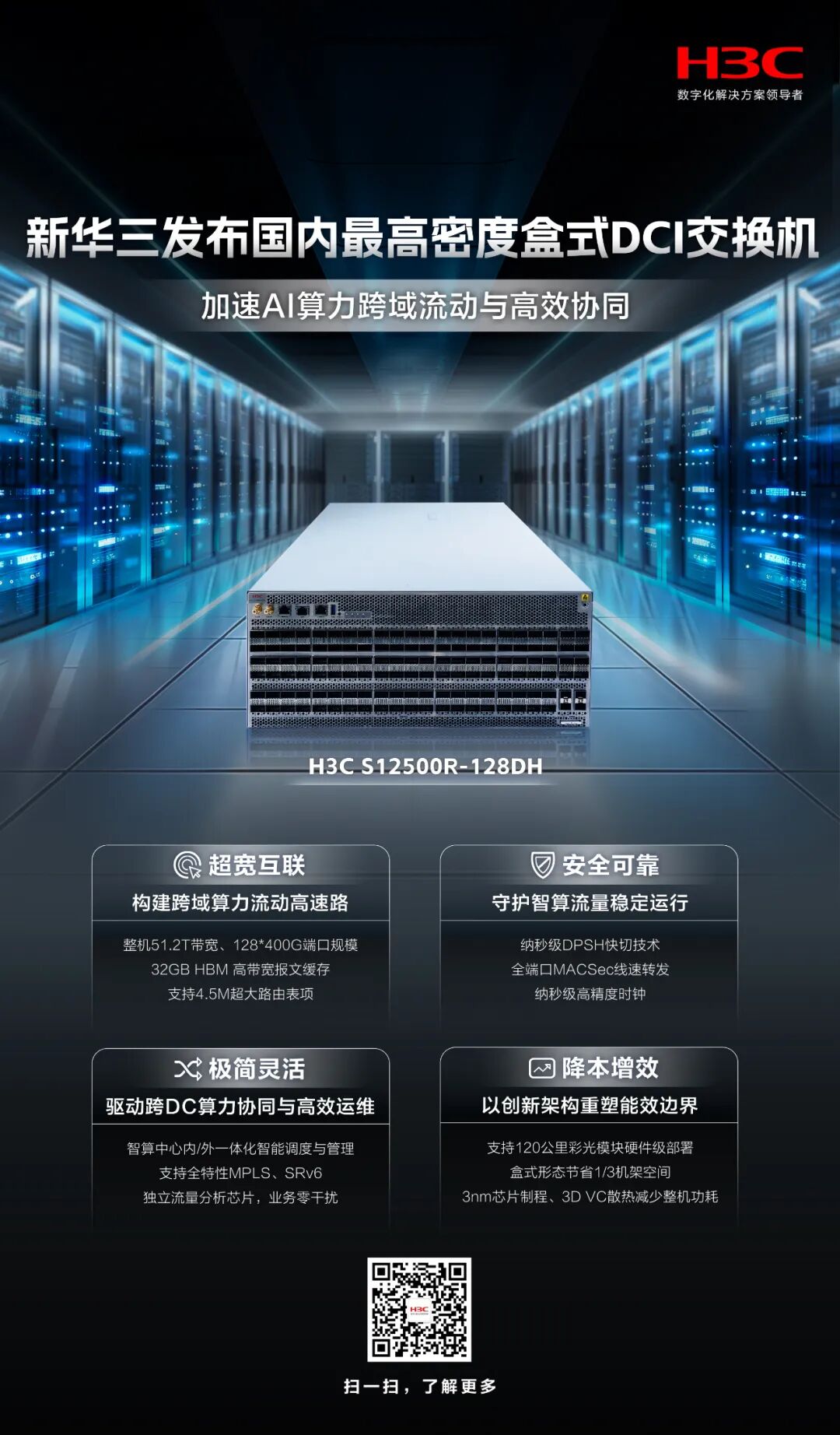 ICC訊 近日,紫光股份旗下新華三集團(tuán)正式發(fā)布國內(nèi)最高密度盒式DCI交換機(jī)——H3C S12500R-128DH。該產(chǎn)品面向大規(guī)模AI集群與跨域智算中心互聯(lián)場景,以全新盒式形態(tài)設(shè)計實(shí)現(xiàn)51.2T超高帶寬、高性能轉(zhuǎn)發(fā)與高能效比,在保障高密度互聯(lián)的同時大幅降低能耗與部署復(fù)雜度,為互聯(lián)網(wǎng)、云計算及大型智算中心構(gòu)筑面向未來的高速互聯(lián)底座,全面加速AI算力的高效流動與協(xié)同。