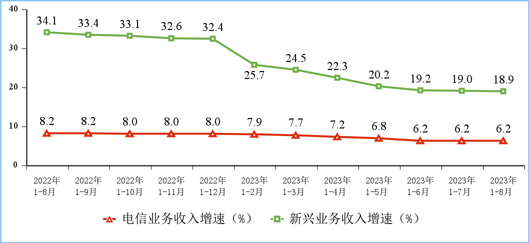 移動(dòng)數(shù)據(jù)流量業(yè)務(wù)收入低速增長(zhǎng)。1-8月份,三家基礎(chǔ)電信企業(yè)完成移動(dòng)數(shù)據(jù)流量業(yè)務(wù)收入4432億元,同比增長(zhǎng)0.5%,在電信業(yè)務(wù)收入中占比為38.8%,拉動(dòng)電信業(yè)務(wù)收入增長(zhǎng)0.2個(gè)百分點(diǎn)。