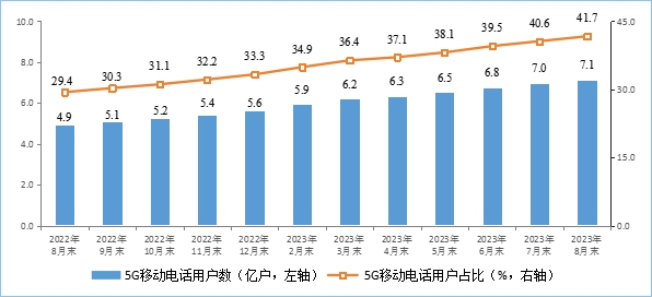 移動(dòng)電話用戶規(guī)模穩(wěn)中有增,5G用戶數(shù)快速發(fā)展。截至8月末,三家基礎(chǔ)電信企業(yè)的移動(dòng)電話用戶總數(shù)達(dá)17.14億戶,比上年末凈增3074萬(wàn)戶。其中,5G移動(dòng)電話用戶達(dá)7.14億戶,比上年末凈增1.54億戶,占移動(dòng)電話用戶的41.7%,占比較上年末提高8.4個(gè)百分點(diǎn)。