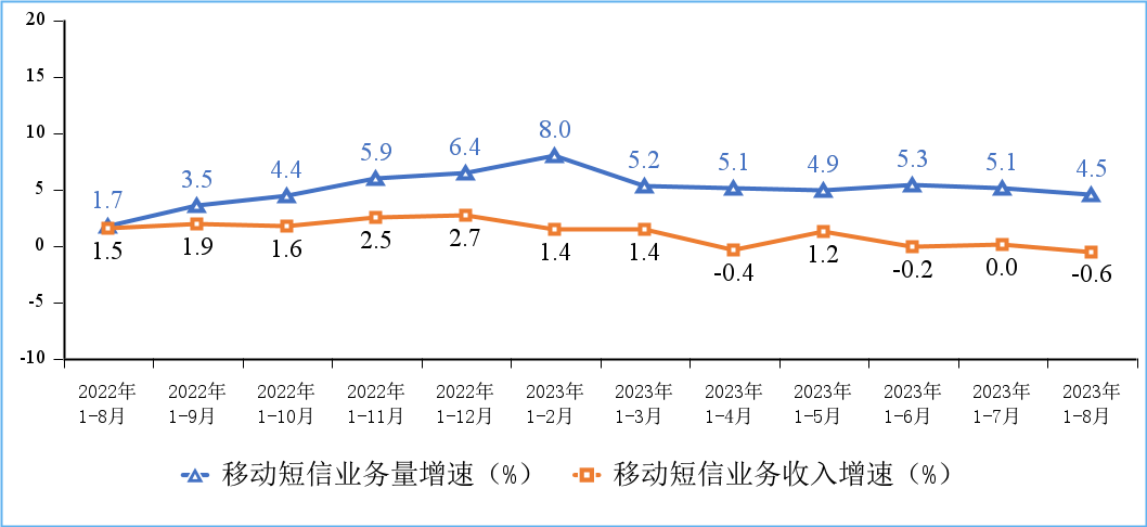 圖9 移動(dòng)短信業(yè)務(wù)量和收入同比增長(zhǎng)情況