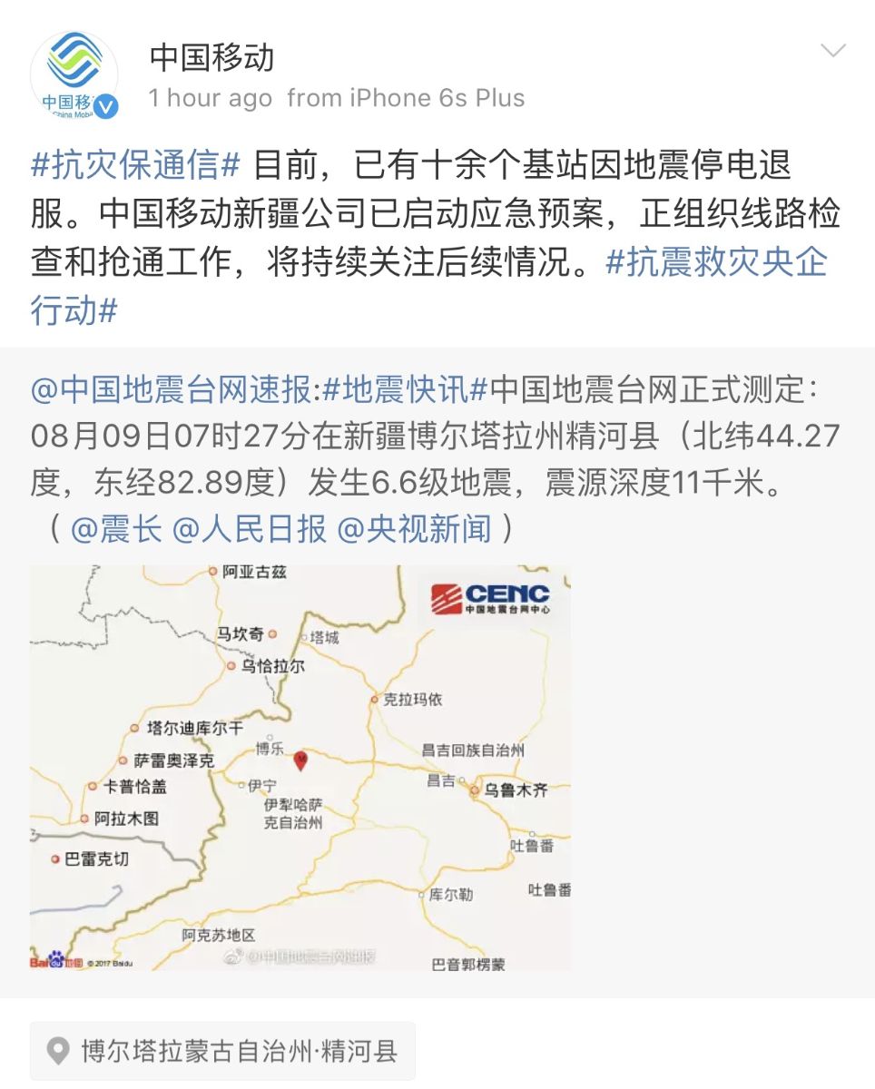 中國移動(dòng)官方微博發(fā)布消息稱,目前,已有十余個(gè)基站因地震停電退服。中國移動(dòng)新疆公司已啟動(dòng)應(yīng)急預(yù)案,正組織線路檢查和搶通工作,將持續(xù)關(guān)注后續(xù)情況。