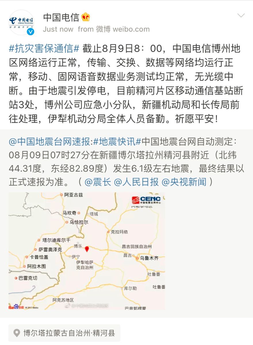 中國電信官方微博發(fā)布消息稱,截止8月9日8:00,中國電信博州地區(qū)網(wǎng)絡(luò)運(yùn)行正常,傳輸、交換、數(shù)據(jù)等網(wǎng)絡(luò)均運(yùn)行正常,移動(dòng)、固網(wǎng)語音數(shù)據(jù)業(yè)務(wù)測試均正常,無光纜中斷。由于地震引發(fā)停電,目前精河片區(qū)移動(dòng)通信基站斷站3處,博州公司應(yīng)急小分隊(duì),新疆機(jī)動(dòng)局和長傳局前往處理,伊犁機(jī)動(dòng)分局全體人員備勤。