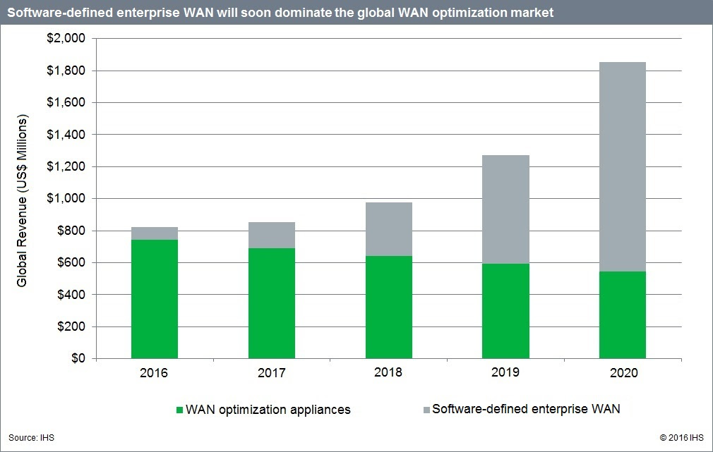 IHS分析師預(yù)計(jì)到2018年,SD-WAN市場發(fā)展速度將會放緩,隨后到2020年會有更多的企業(yè)采用SD-WAN。預(yù)計(jì)到2020年,將會占到廣域網(wǎng)優(yōu)化收入的71%。