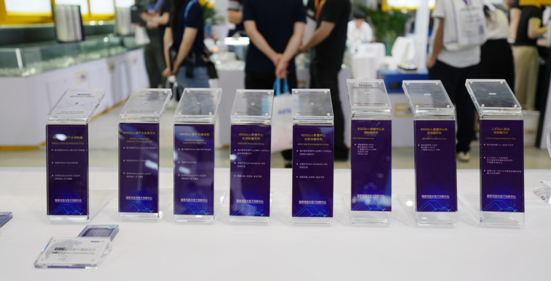 在芯片展臺,NOEIC重點展示了800G 硅光相干接收芯片、800G DR8 硅光調制器芯片、多維復用1.4Tb/s相干調制器芯片及2Tb/s硅基3D集成芯粒(chiplet)。
