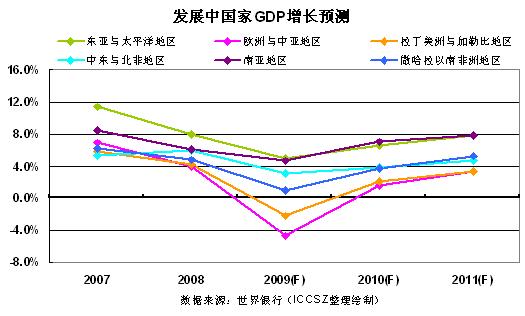 南亞地區(qū):該地區(qū)目睹了資本流入的明顯減少以及投資增長下降,預計2009年GDP增長4.6%,比2008年的6.1%有所下降。預計2010年地區(qū)產出將會增長7%,2011年達到7.8%。不過,長期增長面臨的威脅包括假如全球經濟衰退延長就有可能出現財政壓力增大以及巨額財政赤字。