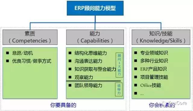 兩人后續(xù)發(fā)展的差距在上面這段聊天中就拉開(kāi)了?,F(xiàn)任總經(jīng)理的這位其實(shí)有整理一份顧問(wèn)能力模型圖(如下圖),因此他能夠?qū)㈨?xiàng)目實(shí)際工作跟這個(gè)能力模型圖做比對(duì),將自己做得不到位的地方在能力模型圖中找到對(duì)應(yīng)的點(diǎn)(知道與高層對(duì)話(huà)、監(jiān)督客戶(hù)工作進(jìn)度屬于項(xiàng)目管理中干系人管理和進(jìn)度管理的內(nèi)容),從而有目的地找方法、途徑去彌補(bǔ)(找一本項(xiàng)目管理的書(shū)系統(tǒng)學(xué)習(xí))。