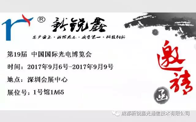 第19屆中國國際光電博覽會(CIOE2017),新銳鑫光通信誠邀行業(yè)朋友、新老客戶蒞臨我司展位(展位號:1號館1A65)暢談行業(yè),共謀發(fā)展。