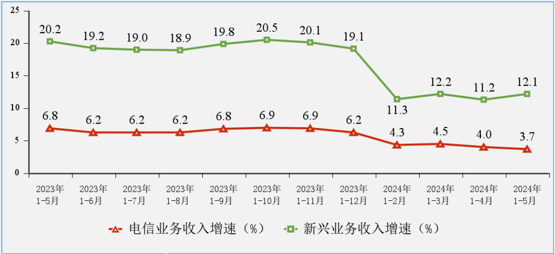 電信業(yè)務收入增速放緩,電信業(yè)務總量保持兩位數(shù)增長。1—5月份,電信業(yè)務收入累計完成7387億元,同比增長3.7%,增速較1—4月份回落0.3個百分點。按照上年不變價計算的電信業(yè)務總量同比增長11.9%。