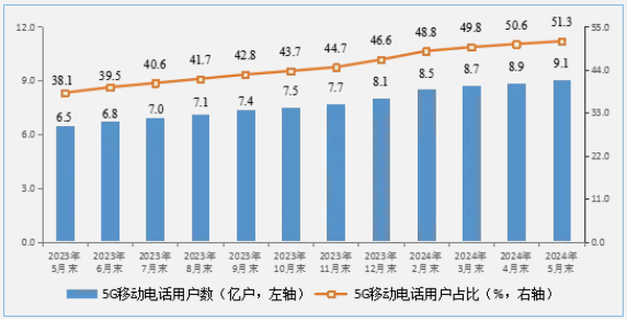 移動電話用戶規(guī)模穩(wěn)中有增,5G用戶數(shù)超9億戶。截至5月末,三家基礎(chǔ)電信企業(yè)及中國廣電的移動電話用戶總數(shù)達17.63億戶,比上年末凈增1953萬戶。其中,5G移動電話用戶達9.05億戶,比上年末凈增8292萬戶,占移動電話用戶的51.3%,占比較上年末提高4.7個百分點。