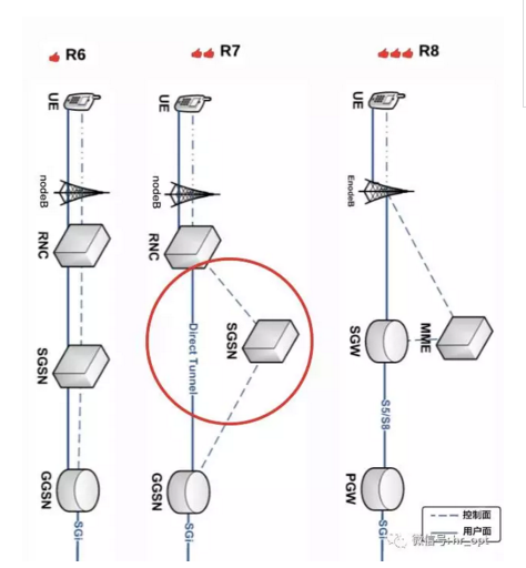 上面這張圖告訴我們,R7開始通過Direct Tunnel技術(shù)將控制面和用戶面分離,在3G RNC和GGSN之間建立了直連用戶面隧道,用戶面數(shù)據(jù)流量直接繞過SGSN在RNC和GGSN之間傳輸。