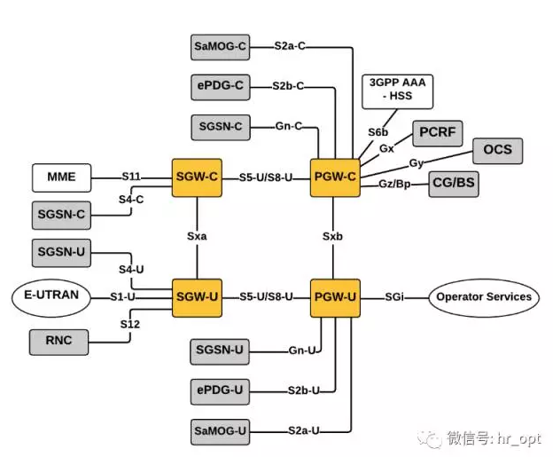 在“全分離式”構(gòu)架下,SGW和PGW被分離為控制面和用戶面兩部分(如上圖黃色填充部分,SGW分離為SGW-C和SGW-U,PGW分離為PGW-C和PGW-U),同樣,SGSN也被分離為控制面(SGSN-C)和用戶面(SGSN-U)。