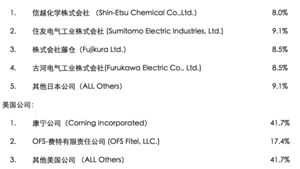 — 2014年商務(wù)部發(fā)布公告,決定對原產(chǎn)于日本和美國的進口光纖預(yù)制棒進行反傾銷調(diào)查,調(diào)查確定的傾銷調(diào)查期為2013年1月1日至12月31日,產(chǎn)業(yè)損害調(diào)查期為2010年1月1日至2013年12月31日。從公開的文件看,被調(diào)查的企業(yè)包括信越化學(xué)、住友電氣工業(yè)、藤倉、古河電氣工業(yè)和康寧、OFS-費特等一批國際光纖巨頭。