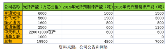 根據(jù)公司公告和網(wǎng)上查到的信息,預(yù)計2016年國內(nèi)廠商的光纖預(yù)制棒產(chǎn)能能夠達到7000噸,根據(jù)上市公司資料,1噸光棒大概能拉3萬芯公里光纖,那么7000噸能夠滿足21000萬芯公里的光纖產(chǎn)能,而前6大光纖廠商的光纖產(chǎn)能是19900萬芯公里。也就是說到2017年,國內(nèi)企業(yè)的光纖預(yù)制棒產(chǎn)能已經(jīng)到位,基本能夠達到自用,甚至有部分外銷。根據(jù)CRU統(tǒng)計數(shù)據(jù)顯示,2015年全球光纖預(yù)制棒供應(yīng)量約12820噸,也就是說到2016年中國的光纖預(yù)制棒產(chǎn)能大概已經(jīng)達到全球的50%~60%左右的規(guī)模。