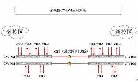 新老校區(qū)之間的光纖一般都是學校租用運營商的,然而租裸纖每年的費用特別高,怎樣才能租用很少的光纖而滿足大業(yè)務量的要求?采用CWDM技術無疑是最佳的解決方案。