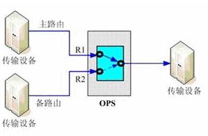 在每個節(jié)點進出兩端接入我公司OPS-1-1光路保護自動切換儀,當主路由光纖發(fā)生故障時,能自動監(jiān)測識別,將傳輸業(yè)務整體切換到備用光纖,切換時間小于15ms,完全不影響業(yè)務的傳輸。切換原理圖如下: