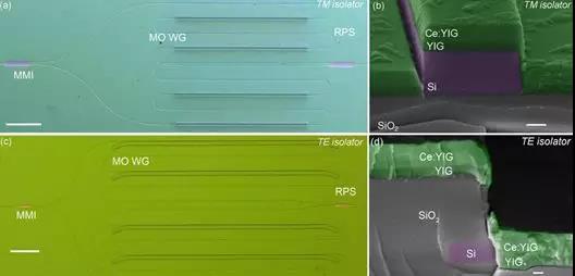 圖2 (a)TE模式 (c) TM模式磁光隔離器的光學(xué)顯微鏡圖,標(biāo)尺長度為100 μm(b)TM模式 (d) TE模式磁光波導(dǎo)截面掃描電鏡圖,標(biāo)尺長度為100 nm