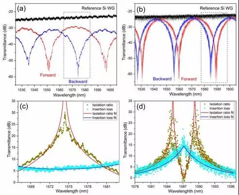 此外,通過相同工藝,首次研制了基于SiN波導(dǎo)的TE偏振磁光隔離器,證明了此技術(shù)對多材料平臺的兼容性。該工作報道的硅基單片集成光隔離器隔離度達(dá)到30 dB、插損為5 dB、20 dB隔離帶寬為2 nm,為目前硅基光隔離器報道的最高水平,尺寸在寬帶器件中也是最小的。