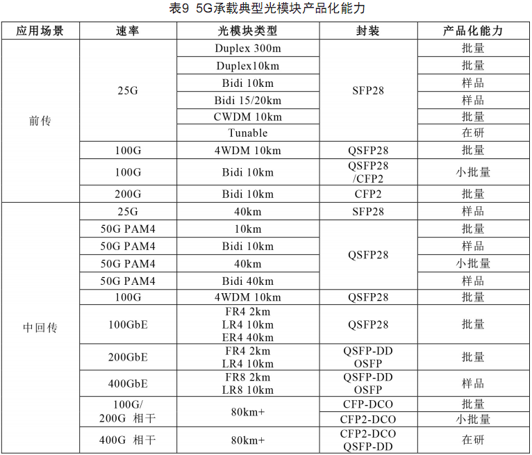 國內外光模塊廠商圍繞5G應用積極開展5G承載光模塊研發(fā),目前的產品化能力如表9所示。5G前傳25Gb/s光模塊方面,波長可調諧光模塊處于在研階段,BiDi光模塊處于樣品階段,其他類型的光模塊均已成熟。前傳100Gb/s BiDi光模塊的應用規(guī)模較小,200Gb/s BiDi光模塊和100Gb/s 4WDM光模塊已經成熟。5G中回傳50Gb/s PAM4 BiDi 40km光模塊、400Gb/s直調和相干光模塊均處于在研階段,其他類型光模塊已基本成熟。