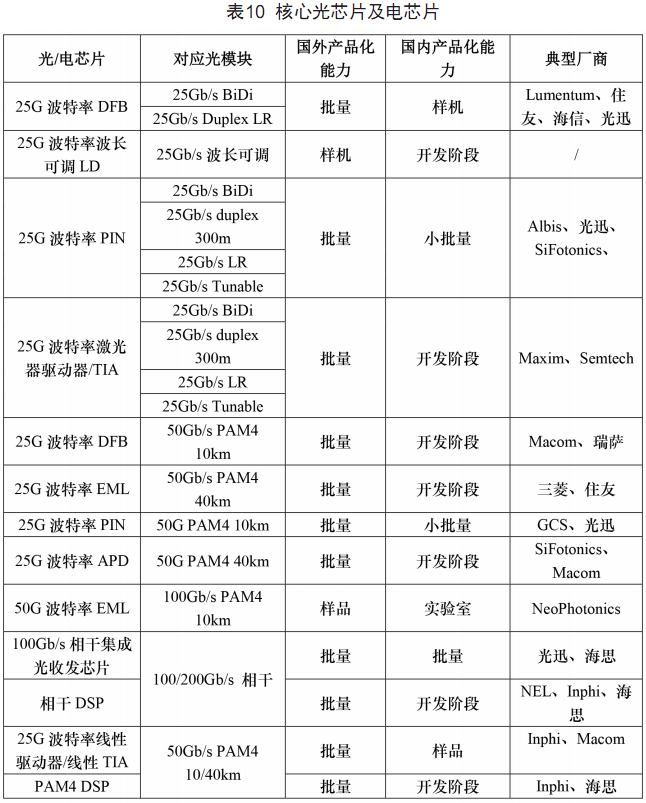 5G典型光模塊所使用的核心光芯片及電芯片產業(yè)化能力如表10所示,領先國家均已基本成熟,國內在整體上尚處于研發(fā)階段。目前,商業(yè)級/工業(yè)級25G波特率的DFB、EML、50G波特率的EML激光器芯片、窄線寬波長可調激光器芯片、100Gb/s相干集成光收發(fā)芯片、25/50G波特率的激光器(調制器)驅動/TIA跨阻放大器、PAM4和相干 DSP等IC芯片主要由國外廠商提供,國內產業(yè)化能力與國外差距較大。