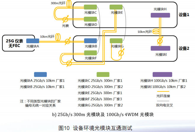 如圖10所示配置,在設備環(huán)境關閉FEC模式下,25Gb/s BiDi 10km光模塊(1330nm/1270nm方案)實現10km光纖+3dB衰減多廠家互通傳輸;25Gb/s 300m光模塊實現300m光纖+3dB衰減多廠家互通傳輸;100Gb/s 4WDM 10km光模塊實現10km光纖+3dB衰減異廠家互通傳輸。