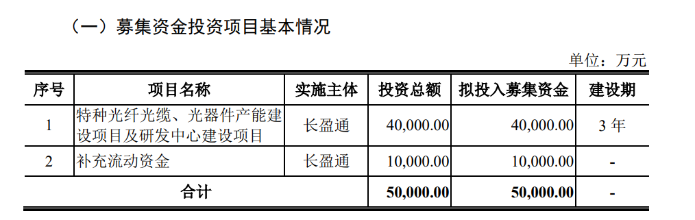 公司本次擬公開發(fā)行不超過2353.3544萬股人民幣普通股(A股),募集資金扣除發(fā)行費用后將全部用于與公司主營業(yè)務(wù)特種光纖光纜、光器件產(chǎn)能建設(shè)項目及研發(fā)中心建設(shè)項目和補充流動資金。