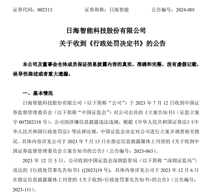 ICC訊 1月4日消息,日海智能(002313.SZ)發(fā)布公告稱(chēng),2024年1月2日,公司收到深圳證監(jiān)局送達(dá)的《行政處罰決定書(shū)》。