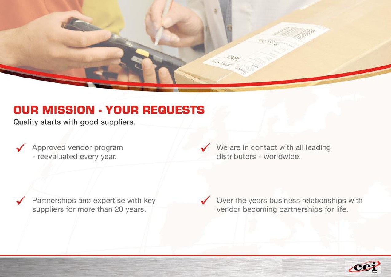 Booking Services長(zhǎng)期供貨-代理和分銷產(chǎn)品; Spot Buy緊急供貨:現(xiàn)貨服務(wù); Third Party purchase代買服務(wù); Stock Buy Back呆滯庫(kù)存處理; VMI 備貨交貨.