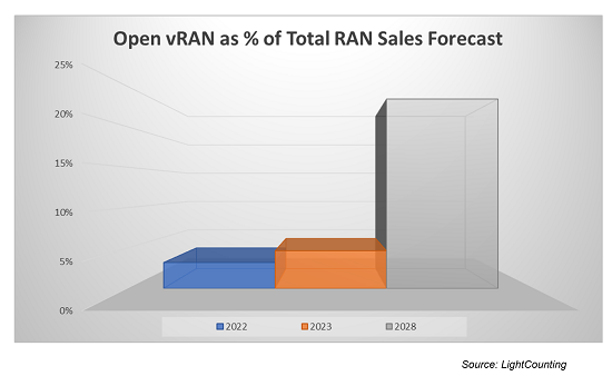 因此,由于業(yè)內(nèi)的一些質(zhì)疑,Open vRAN市場將出現(xiàn)短期(2023-2024年)暫停。LC對2023年的預(yù)測被向下修正,但仍顯示增長。好消息是,全世界都越來越一致地認(rèn)為,Open vRAN將在本十年的后半段成為移動網(wǎng)絡(luò)的主要架構(gòu)組件。因此,該市場2022-2028年的復(fù)合年增長率為33%,到2028年,Open vRAN將占全球RAN總銷售額的20%以上。