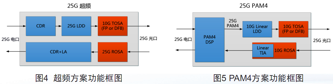 光模塊可采用25G和10G兩種波特率的激光器芯片來實(shí)現(xiàn)。25G波特率工業(yè)級(jí)激光器芯片可靠性要求與量產(chǎn)工藝要求較高,市場供應(yīng)渠道有限。10G波特率工業(yè)級(jí)激光器芯片能充分利用成熟的供應(yīng)鏈,可有效降低光模塊成本,目前業(yè)界主要有超頻、PAM4高階調(diào)制兩種實(shí)現(xiàn)方案,功能框圖分別如圖4和圖5所示。