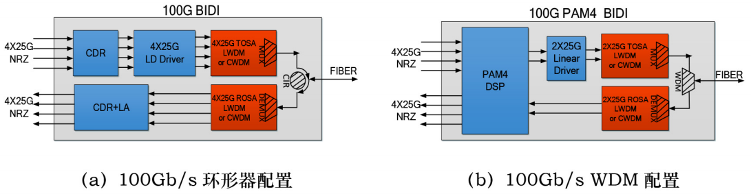 100/200Gb/s BiDi 10km光模塊的技術(shù)方案正處于研究階段,典型實(shí)現(xiàn)方式包括環(huán)形器和WDM兩種,功能框圖如圖8所示。