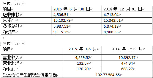 7.財務(wù)狀況:經(jīng)審計,截止2015年12月31日江蘇奧雷總資產(chǎn)為15,885.83萬元,應(yīng)收賬款為5,110.02萬元,負(fù)債總額為6,310.58萬元,凈資產(chǎn)為9,575.25萬元,2015年1-12月實現(xiàn)營業(yè)收入10,018.99萬元,營業(yè)利潤為541.45萬元,凈利潤577.18萬元。2015年江蘇奧雷經(jīng)營活動產(chǎn)生的現(xiàn)金流量凈額為596.75萬元。