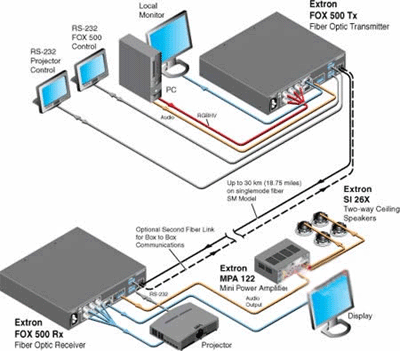 Extron FOX 500 Tx/Rx光纖延長(zhǎng)器包括發(fā)送器和接收器,用來通過單條光纜進(jìn)行遠(yuǎn)距離傳輸高分辨率RGB信號(hào)、音頻和RS232控制信號(hào)。它特別針對(duì)可靠性和優(yōu)異的高分辨率圖像質(zhì)量而設(shè)計(jì),采用Extron獨(dú)特的全數(shù)字零壓縮技術(shù),實(shí)現(xiàn)了完美的逐一像素的計(jì)算機(jī)視頻傳輸,最高分辨率可達(dá)UXGA(1600X1200)。特別針對(duì)視音頻系統(tǒng)而設(shè)計(jì)的FOX 500還包括了許多面向集成商的友好特性,例如圖像調(diào)整和校準(zhǔn),接收器的雙路RGB和音頻輸出,多位置RS-232控制、機(jī)架安裝能力以及實(shí)時(shí)系統(tǒng)監(jiān)控等。