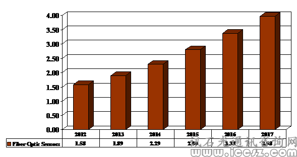 ICCSZ訊 據(jù)來自ElectroniCast的最新報告數(shù)據(jù)顯示,從2012年到2017年間,全球光纖傳感器(包括點分式和分布式)消費值的平均年增幅高達20.3%,其年消費值將從2012年的15.8億美元增長至2017年的39.8億美元。