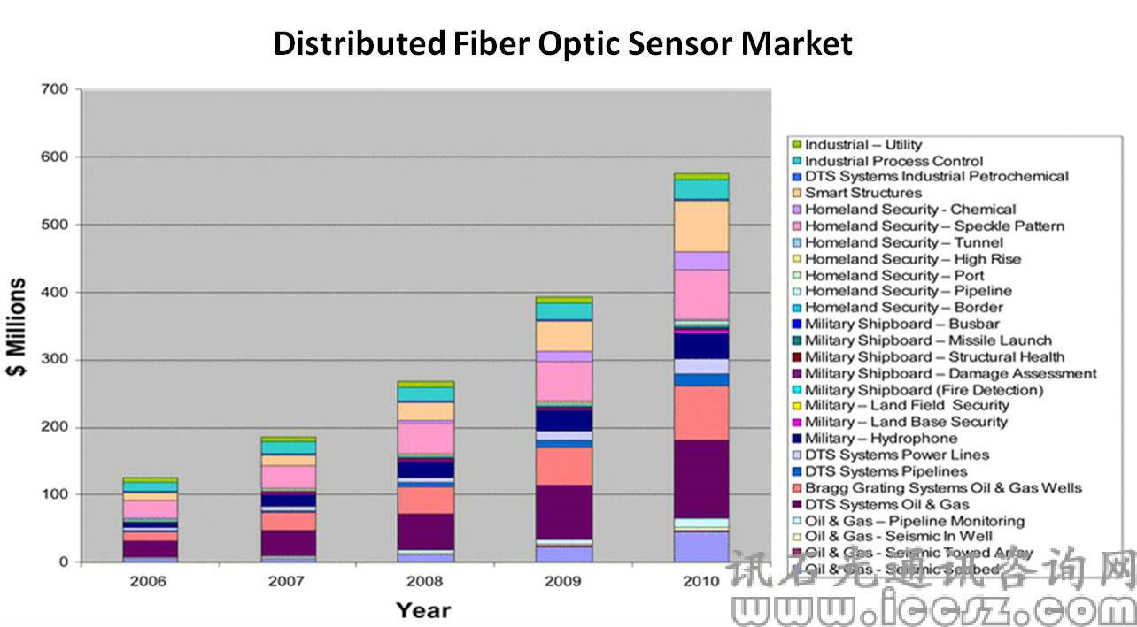 然而,美國占據(jù)全球光纖傳感器的絕大部分市場份額。據(jù)相關資料顯示2007年美國光纖傳感市場價值為2.35億美元,2008年為3.3億美元,2009年則為4.3億美元左右,預計到2014年將達16億美元左右,其復合年均增長率為30%,比全球復合年均增長率高出10個百分點左右。