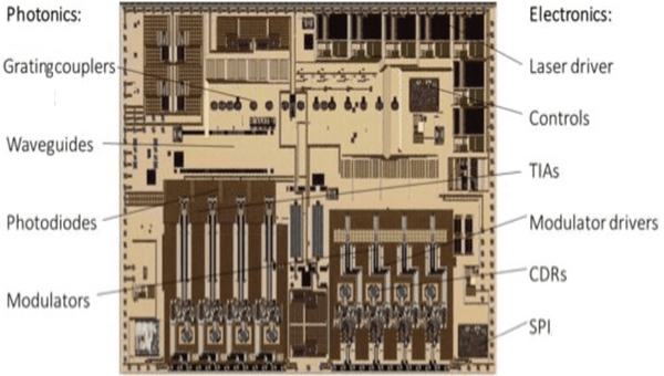 芯片中有兩種光柵耦合器,第一種為單光極化式光柵耦合器,用于耦合DFB鐳射光源及用于光訊號發(fā)射端,另一種為雙極化分光式光柵耦合器,用于無特定光極化方向輸入之光信號接收端。因為采用相同波長輸出的PSM4傳輸結(jié)構(gòu),所以只用一顆高功率的1310nm DFB鐳射輸入。如圖6下所示,DFB鐳射置于硅光平臺(Si Optical Bench)上,經(jīng)球型透鏡聚光及法拉第光極化旋轉(zhuǎn)器,及上蓋之硅蝕刻形成的反射面將鐳射往下反射,最后經(jīng)半波片,可以將鐳射打入硅光子芯片。法拉第光極化旋轉(zhuǎn)器及半波片在于防止反射的鐳射注入DFB鐳射中,形成不必要的光共振,破壞DFB鐳射的光特性。為制作復(fù)雜的硅光子芯片,Luxtera也開發(fā)多種硅光子元件,如圖7所示,有單光極化式光柵耦合器、雙極化分光式光柵耦合器、鍺光波導(dǎo)式光探測器、相位調(diào)制器、光指向耦合器、光波導(dǎo)終端器、Y型光波導(dǎo)分光器、各式光波導(dǎo)與彎折漸變等結(jié)構(gòu)。 另外早期德國Sicoya也嘗試開發(fā)硅光子芯片結(jié)合驅(qū)動及放大積體電路的整合式光電硅芯片,如圖8所示。不過電芯片采用越小半導(dǎo)線寬所制作的集成電路其頻率性能越佳,而且越省電,特別在單通道100G或以上之傳輸更形重要,因此光芯片與電芯片所需半導(dǎo)體制程線寬要求日漸不同,所以此類的光電整合型芯片逐漸轉(zhuǎn)變?yōu)榉侵髁鳌?