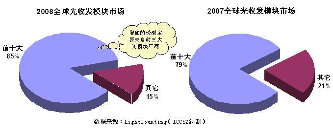 2008年,來自前十大光收發(fā)模塊廠商的收入占整個市場收入的85%,相比2007年上升了6個百分點,市場份額的增長主要來自前三大光模塊供應商。并且這種趨勢可能還會持續(xù)下去,因為在目前經濟衰退的現狀下,為減低風險,客戶會更青睞規(guī)模較大的供應商。
