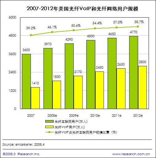iResearch艾瑞咨詢研究eMarketer發(fā)布的2007-2012年美國(guó)光纖VoIP(網(wǎng)絡(luò)語(yǔ)音傳輸)和光纖網(wǎng)絡(luò)用戶規(guī)模數(shù)據(jù)發(fā)現(xiàn),2007年美國(guó)光纖互聯(lián)網(wǎng)用戶規(guī)模達(dá)到3600萬(wàn)人,其中光纖VoIP用戶為1410萬(wàn);預(yù)計(jì)2012年光纖網(wǎng)絡(luò)用戶規(guī)模將達(dá)到4770萬(wàn),光纖VoIP用戶比重將由2007年的39.2%上升到58.7%.