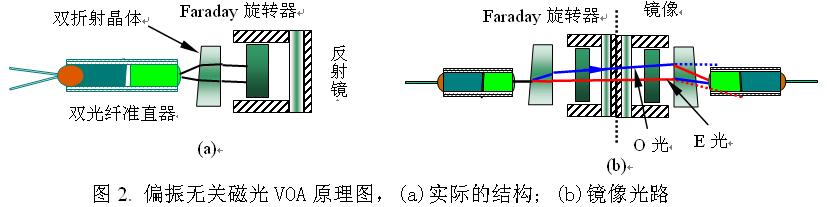 磁光VOA是利用一些物質(zhì)在磁場作用下所表現(xiàn)出的光學(xué)性質(zhì)的變化,例如磁致旋光效應(yīng)(法拉第效應(yīng))等亦可實(shí)現(xiàn)光能量的衰減,從而達(dá)到調(diào)節(jié)光信號的目的。一種典型的偏振無關(guān)磁光VOA結(jié)構(gòu)如圖2所示。