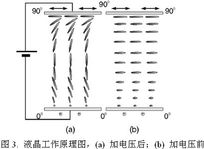 液晶VOA利用了液晶折射率各向異性而顯示出的雙折射效應(yīng)。當(dāng)施加外電場時(shí),液晶分子取向重新排列,將會導(dǎo)致其透光特性發(fā)生變化,其工作原理如圖3所示。
