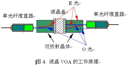 液晶VOA具體的實(shí)現(xiàn)方式如圖4所示。由入射光纖入射的光經(jīng)準(zhǔn)直器準(zhǔn)直后,進(jìn)入雙折射晶體,被分成偏振態(tài)相互垂直的O光和E光,經(jīng)液晶后,O光變成E光,E光變成O光,再由另一塊雙折射晶體合束,最后從準(zhǔn)直器輸出。當(dāng)液晶材料兩端的透明電極上加載電壓V時(shí),O光和E光經(jīng)過液晶后都改變一定的角度,經(jīng)第二塊雙折射晶體,每束光又被分成O光和E光,形成了4束光,中間兩束最后合成一束從第二塊雙折射晶體出射,由準(zhǔn)直器接收,另外兩束從第二塊雙折射晶體出射后未被準(zhǔn)直器接收,從而實(shí)現(xiàn)衰減。因此,通過在液晶的兩個電極上施加不同的電壓控制光強(qiáng)的變化,可以實(shí)現(xiàn)不同的衰減。