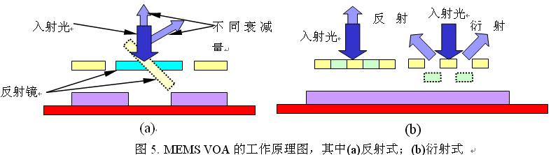 MEMS是此領(lǐng)域中較新的應(yīng)用技術(shù),經(jīng)過近幾年的發(fā)展,MEMS Chip的生產(chǎn)工藝已經(jīng)趨于成熟,有力地推動了MEMS VOA的應(yīng)用。在光網(wǎng)絡(luò)中應(yīng)用,以MEMS技術(shù)為基礎(chǔ)的產(chǎn)品也具有明顯的價(jià)格和性能上的優(yōu)勢。MEMS VOA有反射式VOA和衍射式VOA,如圖5所示。