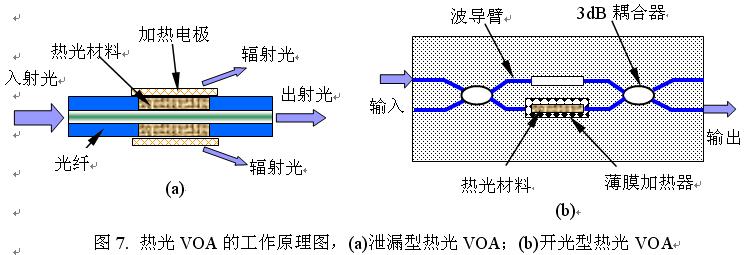 熱光VOA主要是利用一些材料在溫度場中所具有的光學(xué)性質(zhì)變化特性,如溫度變化所導(dǎo)致的熱光材料折射率的變化等。按照結(jié)構(gòu)的不同,主要可以分為兩大類,泄漏型和開光型VOA。