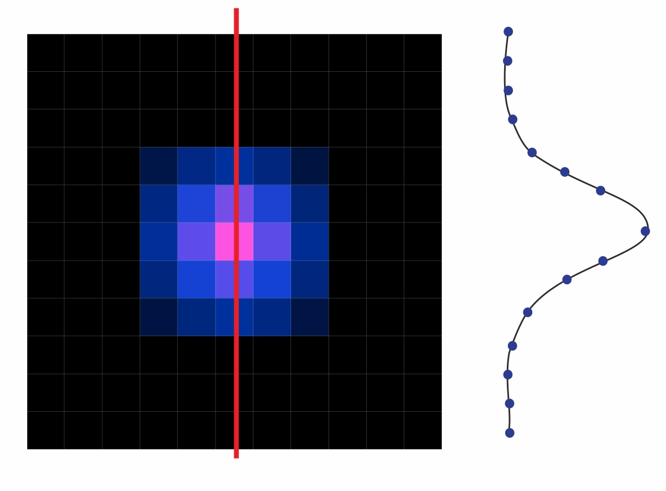相機(jī)式基于相機(jī)靶面成像的原理,光斑的形態(tài)由眾多像素的亮暗程度給出,所以我們只需要取光斑中心的一列像素值(圖中紅線)就可以得到一個(gè)側(cè)面輪廓圖。