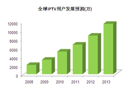 到2010年,IPTV用戶將再增長56%,達(dá)到5200萬。2013年,用戶數(shù)量將增長一倍,達(dá)到11560萬。