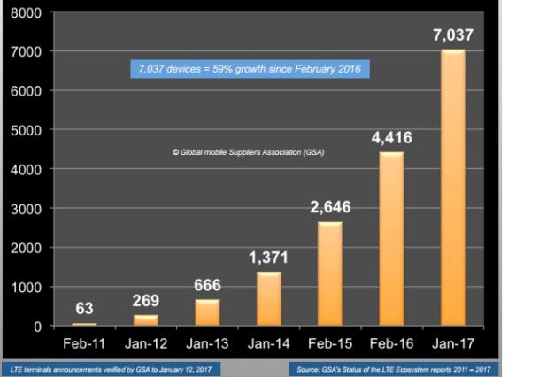 Iccsz訊 1月17日消息,GSA于1月中旬發(fā)布最新LTE生態(tài)報(bào)告稱,全球目前共發(fā)布了7037款LTE終端,分別來自517個(gè)供應(yīng)商。其中,智能手機(jī)達(dá)到4559款。